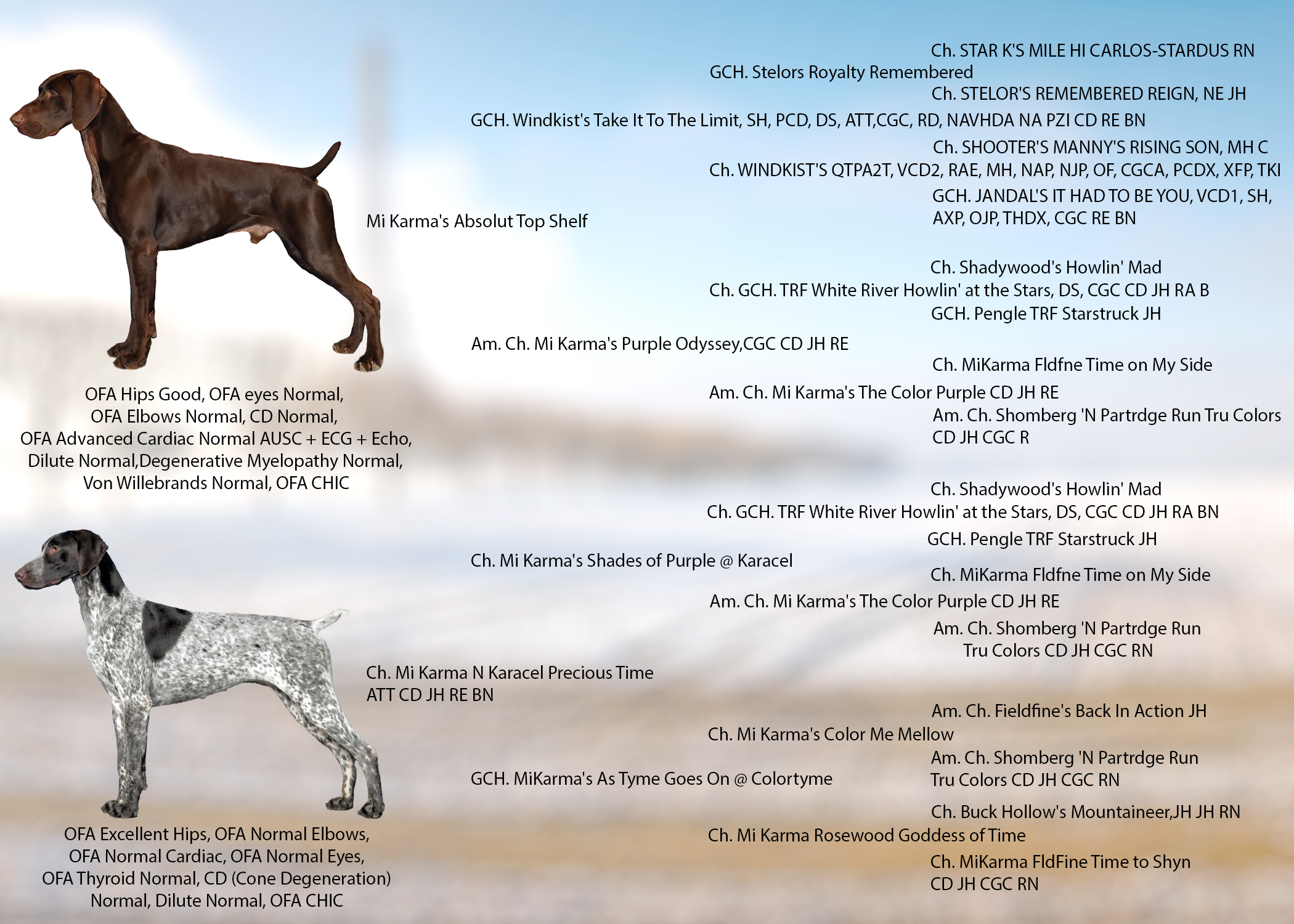 In keeping with our focus on health, temperament and versatility- these two have proven that they can do it all. Both parents are multi-titled, GSPCA VC recipients, OFA CHIC certified.